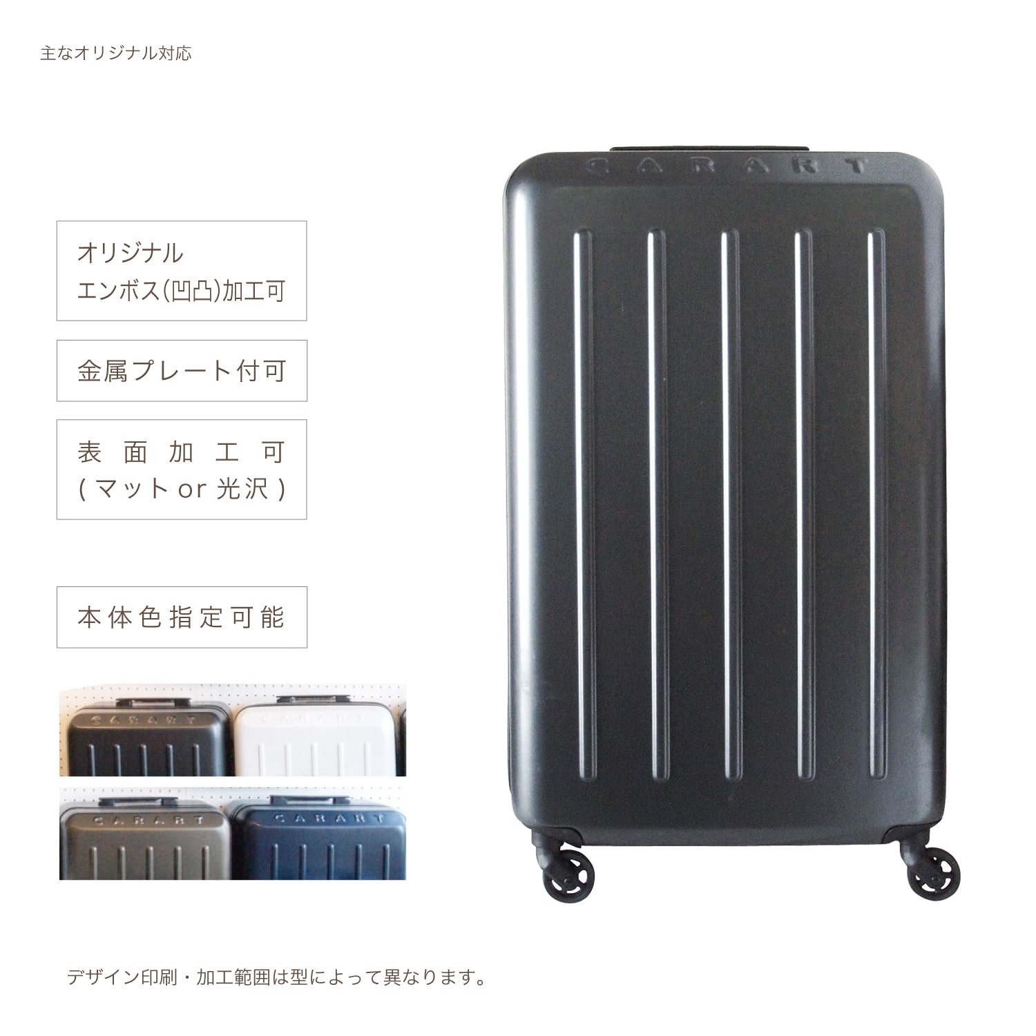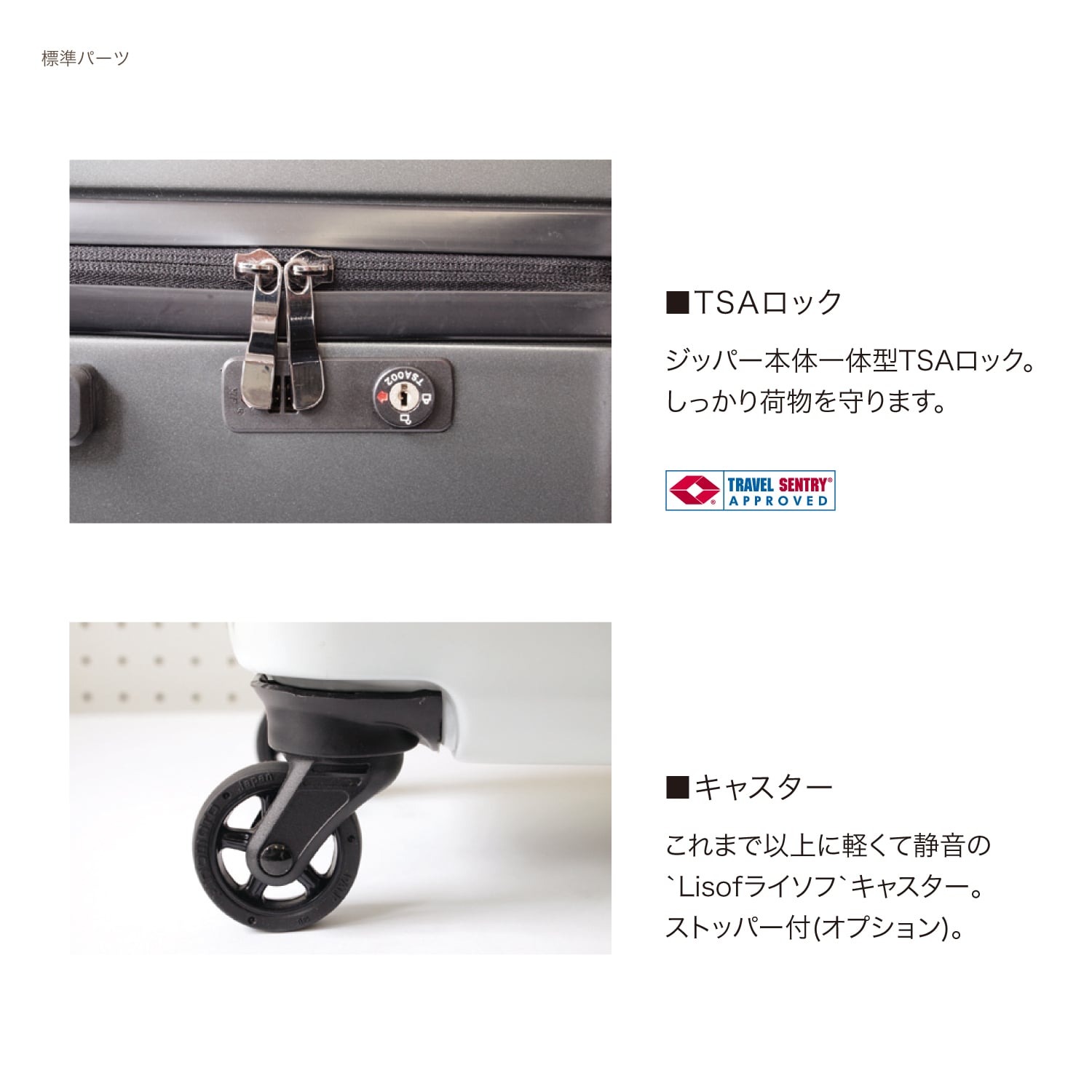 - å‰ãƒ»å¾Œç®±ï¼ˆè¡¨é¢åŠ å·¥ï¼šãƒžãƒƒãƒˆ or 光沢指定å¯ï¼‰ã€ã‚¸ãƒƒãƒ‘ーカãƒãƒ¼ã€ã‚ャスターカãƒãƒ¼ã€ä¼¸ç¸®ãƒãƒ³ãƒ‰ãƒ«ï¼ˆæ¨¹è„‚部ã®ã¿ï¼‰ã€ä¸Šéƒ¨ãƒãƒ³ãƒ‰ãƒ«ã€TSAãƒãƒƒã‚¯ã€ã‚¤ãƒ³ãƒŠãƒ¼ãƒ‘ーツ