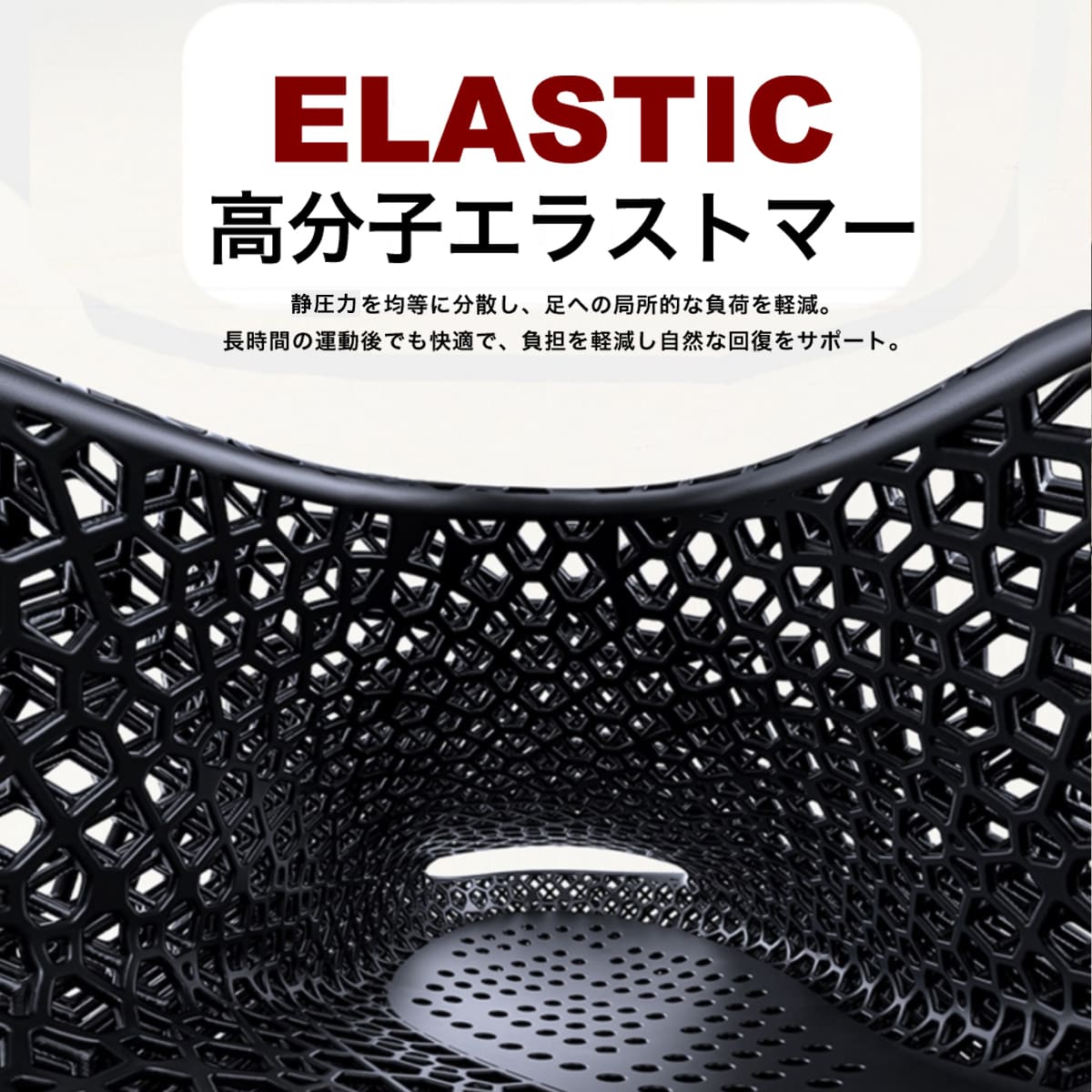 • 弾性マトリスク構造ã§ã€è¶³è£ã«ã‹ã‹ã‚‹åœ§åŠ›ã‚’ç·©å’Œã—ã€è¶³åº•マッサージã®ã‚ˆã†ãªæ§‹é€ ã§è¡€è¡Œã‚’促進。