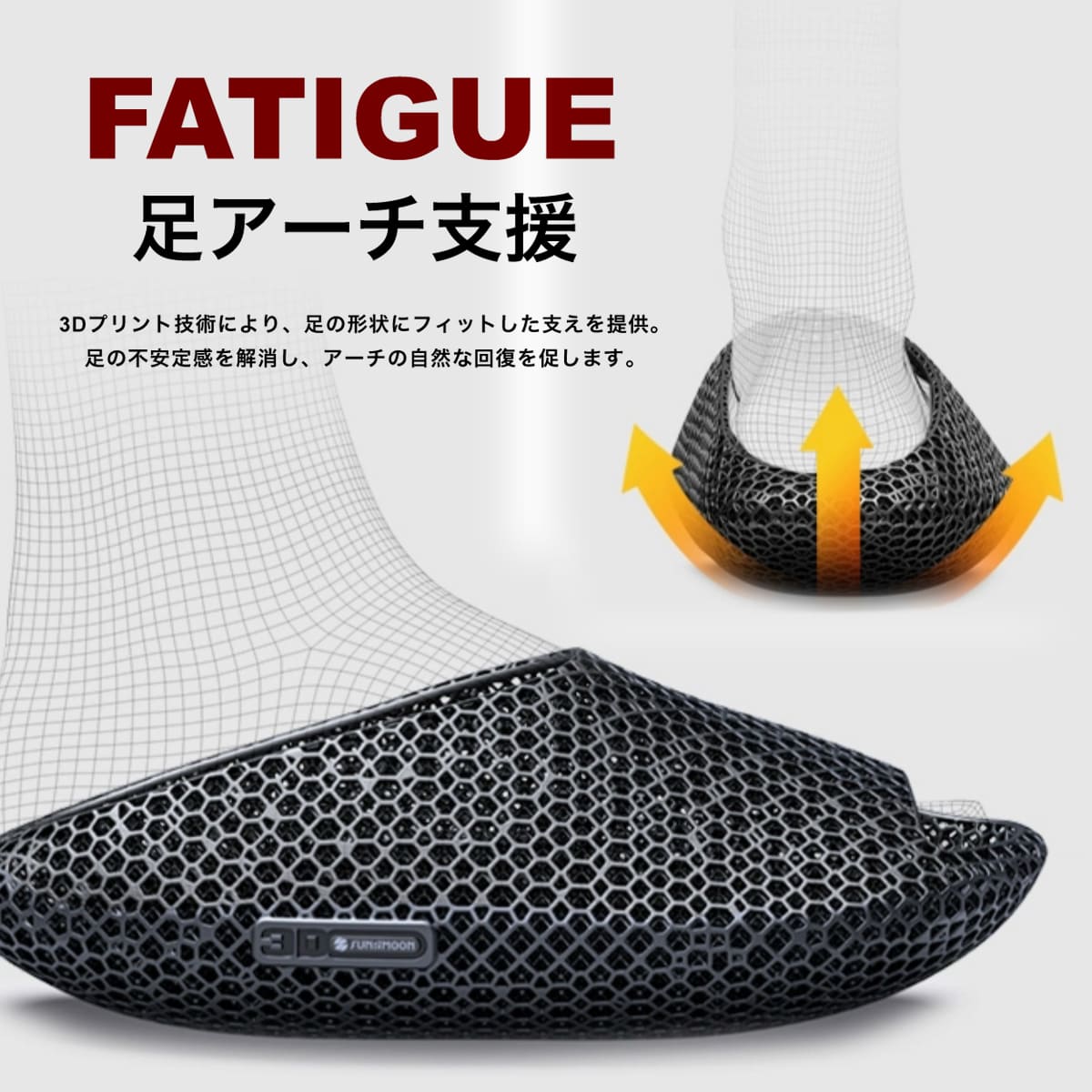 • 3Dプリント技術ã«ã‚ˆã‚Šã€è¶³ã®å½¢çжã«ãƒ•ィットã—ãŸæ”¯ãˆã‚’æä¾›ã€‚​